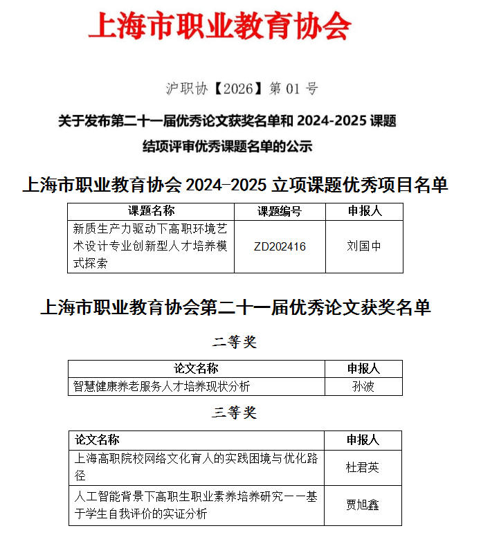 近日,上海市职业教育协会发布沪职协【2026】第01号公示,公布了第二十一届优秀论文获奖名单及2024-2025立项课题优秀结项名单。学校教师在此次评选中表现亮眼,一举斩获1项优秀课题成果和3项优秀论文奖项,充分彰显了学校在职业教育教学改革与科研创新领域的硬核实力。