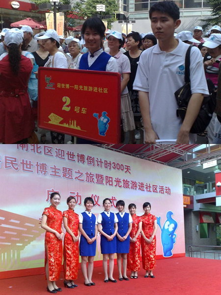 在迎世博倒计时300天之际,由闸北区旅游局主办的“闸北区迎世博倒计时300天社区居民世博主题之旅暨阳光旅游进社区活动启动仪式” 在大宁国际商业广场隆重举行。来自08空乘班的7名礼仪志愿者,承担了大会的引领、颁奖、举牌以及带队等工作。她们以高度的职业素养以及认真细致的态度协助此次活动取得圆满成功。(经管系)