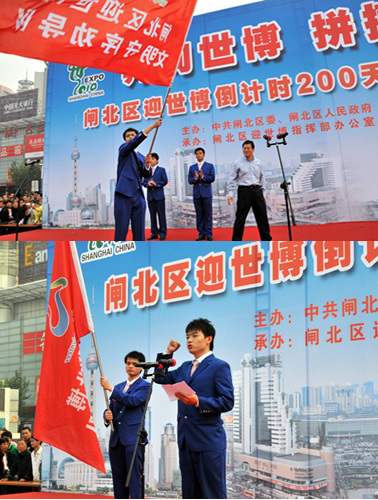 为扎实推进迎世博各项活动,切实提升闸北城市面貌和市民素质,以“奔向世博,拼搏200”为主题,闸北区迎世博倒计时200天主题活动于10月13日在上海站南广场隆重举行。闸北区委书记方惠萍、区长周平等区委、区政府领导出席活动。来自区各企事业单位、街道镇代表共20支方队到场。学院经管系空乘与中澳专业的一百名学生以闸北区首批迎世博“文明守序劝导员”的身份出席了此次活动。活动中,在区长周平主持下,区委区政府领导向学院劝导员队伍授予旗帜,并由学生代表上台宣誓,全体学生劝导员将尽己所能,倡导文明,为闸北添光彩,为世博做贡献。在区委书记方惠萍宣布出发后,一百名学生劝导员列队离开会场,分散到火车站周边道口,协助民警进行协管工作。一百名学生劝导员们以整齐的服装和积极的风貌,成为现场一道独特的风景线。