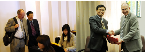 近日,英国知山大学校长David Law等一行4人来院,与学院院长袁允伟、副院长蔡红洽谈校际合作项目。学前教育系副主任侯素雯、陈莉老师参加了洽谈会。经过交流,双方达成合作意向,签署了包括学前教育专业专科及以上学历进行教育合作、国际幼儿早期教育实习、对中国幼儿园领导和教师短期培训等项目在内的合作备忘录。双方并就交换教学用书,以及后续进行“2+2”合作办学模式展开卓有成效的探讨。最终,知山大学承诺在今年6月底前整理好“2+2”模式的合作协议,这就意味着,我院与英国高校的合作将迈出实质性一步。会后David Law校长一行参观了数码钢琴房等实训室,实地了解我院学前专业的办学情况。