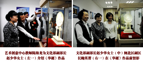 近日闸北区“海上文化中心”揭幕,我院艺术创意中心携象牙篾丝作品《华诞》、《花好月圆》参展。国家文化部副部长赵少华女士亲临现场,观摩象牙篾丝技艺展示及作品。参观期间赵少华副部长勉励行健艺术创意中心再接再厉、推陈出新,在文化传承创新工作上再创佳绩。(人文系)