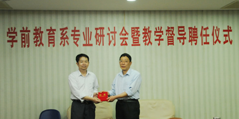 近日,学前教育系召开学前专业研讨会,院长袁允伟代表学院聘请华东师范大学学前教育系教授朱家雄担任学院教学督导,并颁发聘书。朱家雄教授系华东师范大学学前与特殊教育学院教授(博士生导师,终身教授),教育部人文社会科学重点研究基地——华东师范大学基础教育改革与发展研究所研究员。