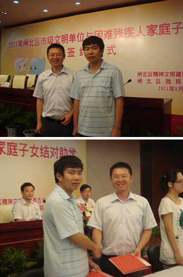 8月23日,由闸北区文明办、区残疾人协会主办的2011年闸北区市级文明单位与困难残疾人家庭子女结对助学签约仪式在海上文化中心举行。区委常委、宣传部部长张锡平出席仪式。学院党委书记黄群,党委宣传部部长、精神文明办主任李杰作为2011年市级文明单位代表参加活动。