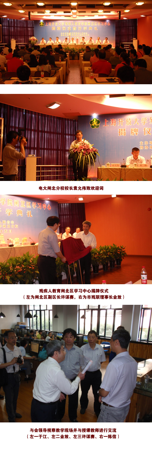 会议由闸北区残疾人理事会理事长张少觐主持。电大闸北分校校长袁允伟致欢迎词。市残联理事长金放、闸北区副区长许谋赛共同为闸北区学习中心揭牌。