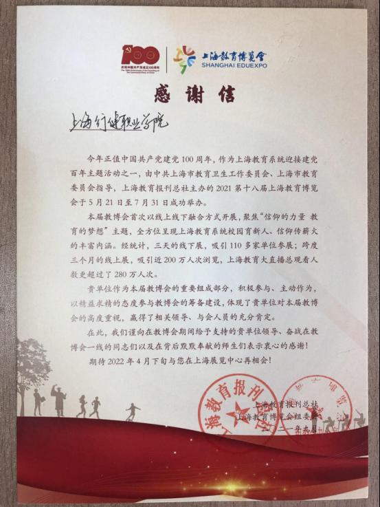 近日,学院收到由上海市教育报刊总社和上海教育博览会组委会办公室寄来的感谢信和荣誉证书,信中对学院积极参与、精益求精的态度予以肯定,对学院领导和奋战在教博会一线的教职工表示衷心的感谢。