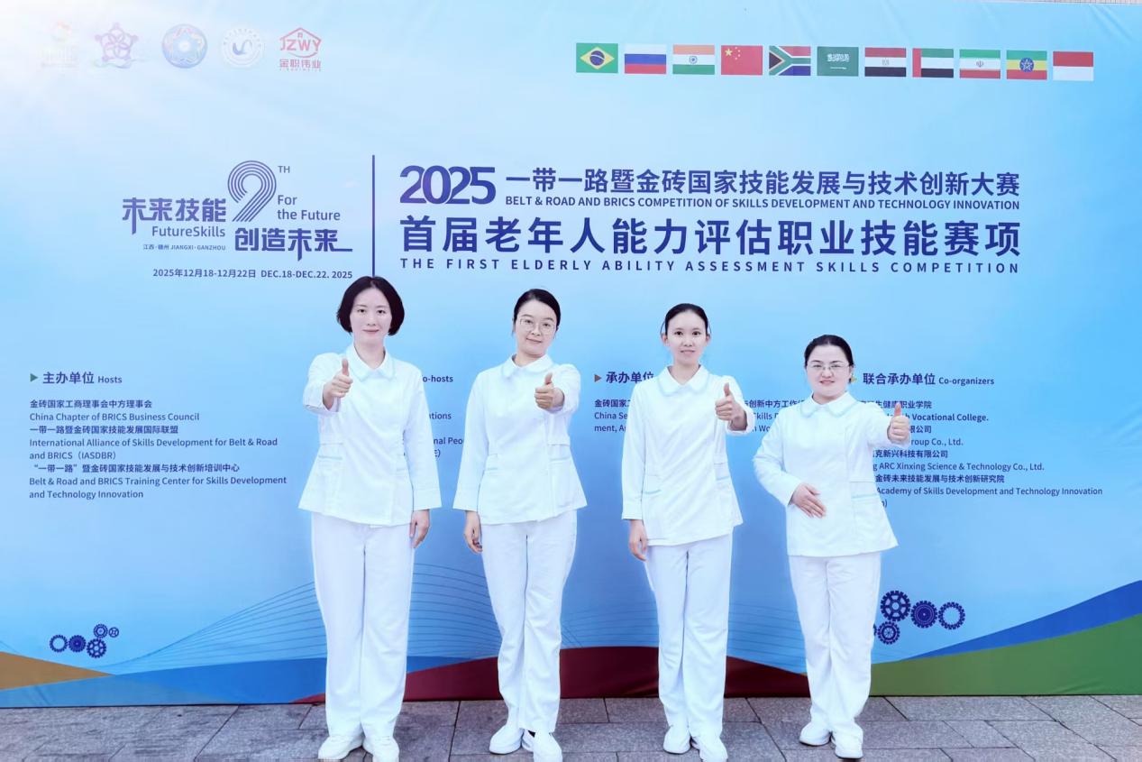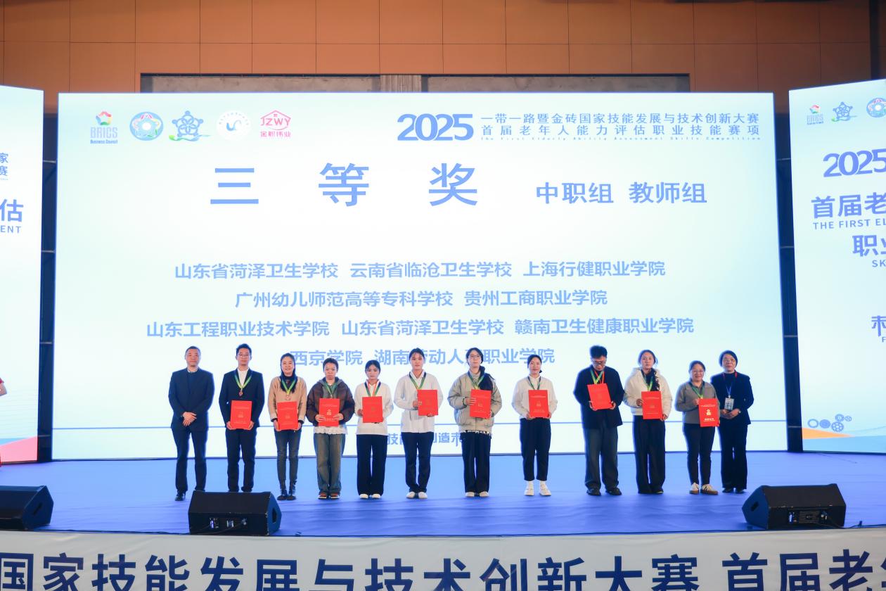 在刚刚结束的2025一带一路暨金砖国家技能发展与技术创新大赛首届老年人能力评估职业技能教师赛中,我智慧康养与教育学院潘太健、单敏月、王羿、张怡四位老师组成的参赛团队,凭借扎实的专业功底与出色的团队协作,一路过关斩将,最终斩获全国三等奖。