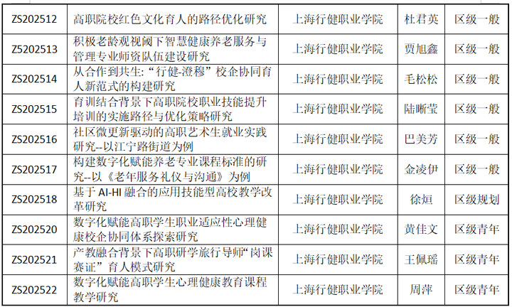 本次获批的课题聚焦红色文化育人、数智赋能教育变革、产教融合协同育人、养老服务星空体育网址入口等核心领域。在红色文化育人领域,课题聚焦高职院校红色文化浸润路径优化,助力静安区大思政课一体化建设,传承红色教育基因;在数智赋能教育领域,课题聚焦AI-HI融合教学改革、数字化养老课程标准构建、学生心理健康教育数字化转型等前沿方向,将为区域教育数字化转型提供鲜活的实践经验;在养老服务星空体育网址入口领域,课题紧扣静安区积极应对人口老龄化的发展需求,从养老师资队伍建设、老年服务课程优化等关键环节开展研究,助力区域养老服务质量提升;在产教融合与就业实践领域,课题积极探索校企协同育人新范式、研学旅行导师"岗课赛证"培养模式及社区微更新驱动艺术生就业等路径,为区域产教融合生态构建和职业教育高质量发展提供有力支撑。