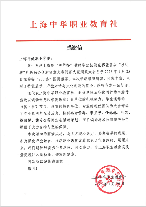 近日,学校收到上海中华职业教育社发来的感谢信。感谢我校为第十三届上海市“中华杯”教师职业技能竞赛暨首届“杉达杯”产教融合创新创意大赛颁奖大会做出的突出贡献。