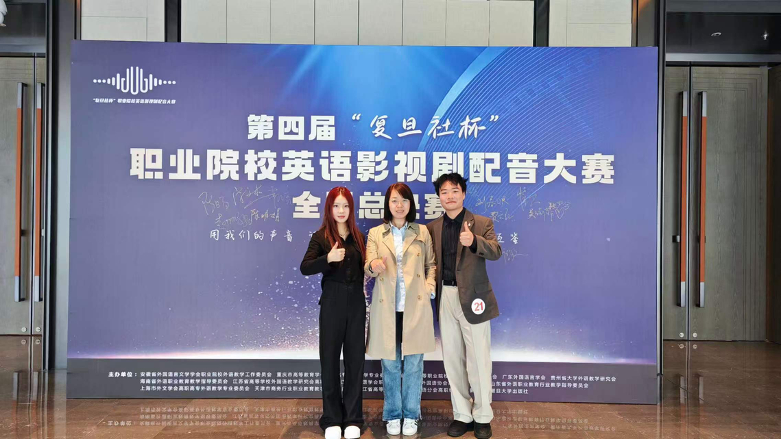4月11日,第四届“复旦社杯”全国职业院校英语影视剧配音大赛全国总决赛在青岛圆满落幕。我校 25 级学前教育专业游佳同学、25 级机电一体化专业李江建同学,在基础教育学院刘彦妮、谭颖两位老师的悉心指导下,凭借扎实的英语功底与出色的舞台表现,在全国大赛中脱颖而出,荣获一等奖,为学校争得了荣誉,充分展现了我校学子昂扬向上的精神风貌。