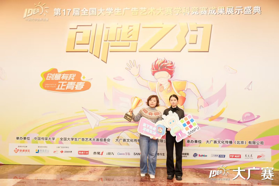 2025年12月6日,第十七届全国大学生广告艺术大赛(大广赛)学科竞赛成果展示盛典在北京中国人民政治协商会议全国委员会礼堂隆重举行。我校创意设计学院广告艺术设计专业2023级学生陈昱好、于雯婷、沈梦圆等同学凭借扎实的专业功底、敏锐的创意洞察与出色的执行能力,其短视频作品《贪心不是“罪”,三福全到位》从全国58万余件参赛作品中脱颖而出,荣获全国二等奖。陈昱好与团队指导老师蒋可扬作为获奖代表受邀出席颁奖典礼。
