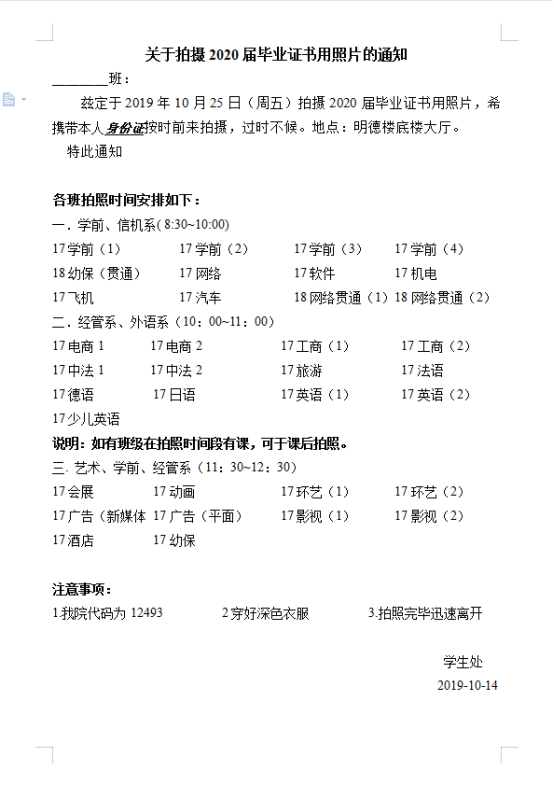 定于2019年10月25日(周五)拍摄2020届毕业证书用照片(个人照),请将《关于拍摄2020届毕业证书用照片的通知》转发至各毕业班,并督促按时拍照,联系电话:15043分机。