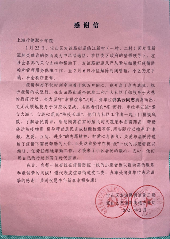 同时,宝山区友谊路街道办事处也向学校寄来了给龚紫云同学的感谢信,希望越来越多的青年们也可以学习她的精神,尽自己的一份力去给身边的人以及这个社会带来温暖和力量。