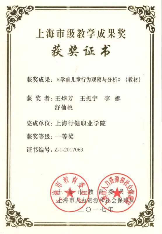 教材《学前儿童行为观察与分析》于2012年被中国教育新闻网评为“2012年度影响教师的100书”;于2017年获得“上海市教学成果奖(职业教育)教材类一等奖”。