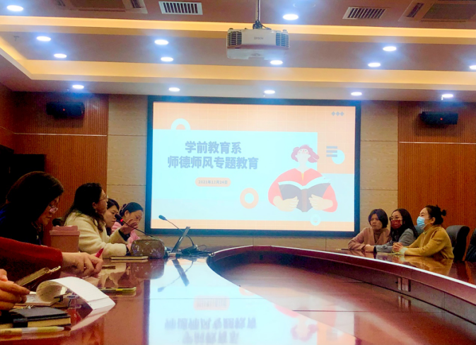 教师是教育之本,师德是教师之本。为了全面加强学前系师德师风建设,筑牢意识形态堡垒, 12月24日中午,学前教育系在2212召开师德师风专题教育,学前教育系主任李娜、党支部书记毛娅君及学系全体教师出席。