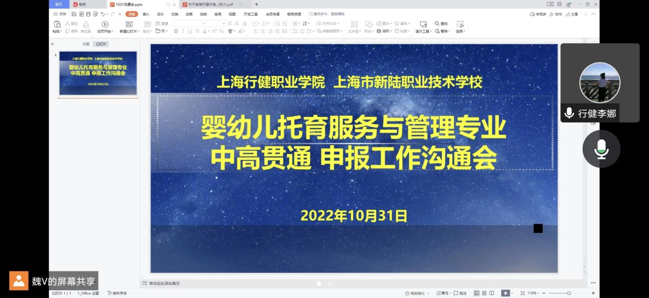 2022年10月31日,学前教育系举办了婴幼儿托育服务与管理专业中高贯通一体化培养申报线上研讨会,学前教育系主任李娜、学前教育专业主任申海燕、婴幼儿托育服务与管理专业潘太健、新陆职业技术学校副校长魏魏、教科研主任丁忠维、教务主任张华、专业部副主任张徽、骨干教师孙曼彤参加会议,会议由魏魏副校长主持。