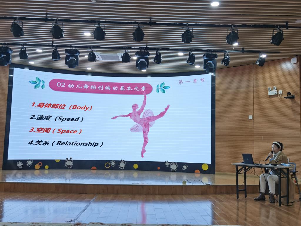 会上由陈洪冰、施泠含两位老师分别为幼儿园一线教师进行“木偶的步态舞——乐曲欣赏与解析”及“舞蹈律动与动物模仿”主题讲座。