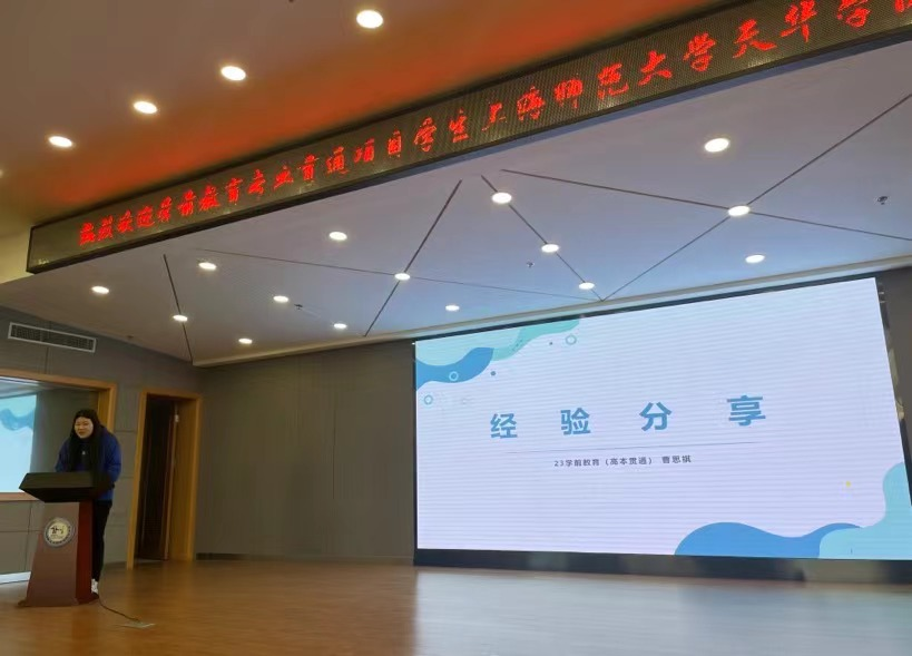 我校20学前高本贯通班毕业生曹思祺代表行健高本贯通项目的学长学姐,分享了她入学天华学院一学期后的心得感悟,表达了自己在新环境中遇到的新挑战,为在场学生打好了心理预防针。