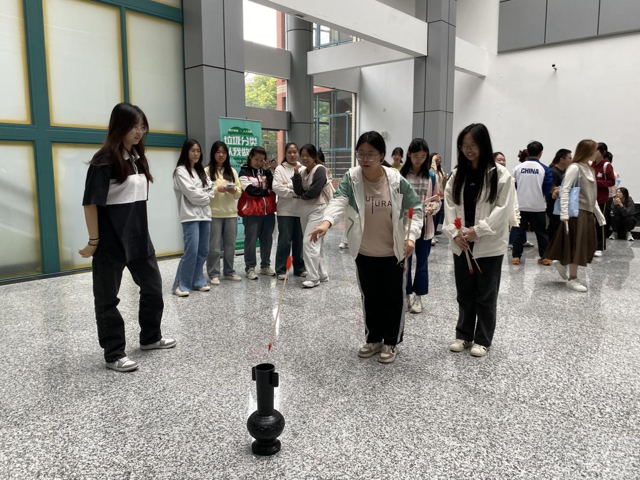 10月22日中午,投壶比赛在我院正式拉开帷幕。投壶是古代士大夫宴饮时常玩的投掷游戏,既锻炼手眼协调性,也增加了手部灵活度。比赛中,同学们屏息凝神,稳住手中的箭,精准投掷。每次命中,现场欢呼雀跃,洋溢着喜悦与自豪的氛围。