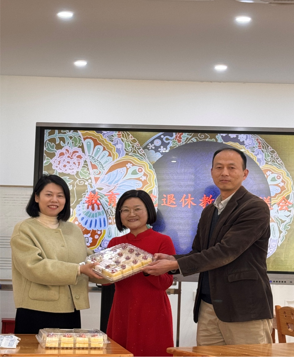 几十载教坛耕耘,虽已到退休年龄,却依然靓丽、隽秀、日久弥新。教育学院孙波院长和毛娅君书记为舒老师送上鲜花和蛋糕,孙院长首先发言感谢了舒老师为学院的老师们树立了优秀的榜样。舒老师优良的教风,永远是老师们学习的榜样,她的教学经验与智慧永远值得青年教师学习。随后,教育学院教师也一一向舒老师表达了感谢并送上祝福。最后,毛书记进行了总结,感谢舒老师多年来为学院作出的贡献,正是有她这样的老教师的辛勤贡献,才奠定了我院蓬勃发展的雄厚基础。