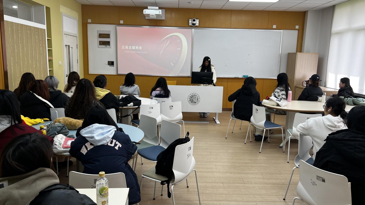 班会期间,主讲先以“无手机课堂”试点为突破口,通过课堂专注度打卡等举措,鼓励同学们更加专注于课堂内容。