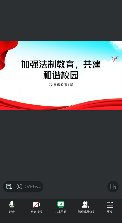 为了进一步增强学生的法制观念和自我保护意识,2022级音乐教育1班于3月开展了以“加强法制教育,共建和谐校园”为主题的班会活动。