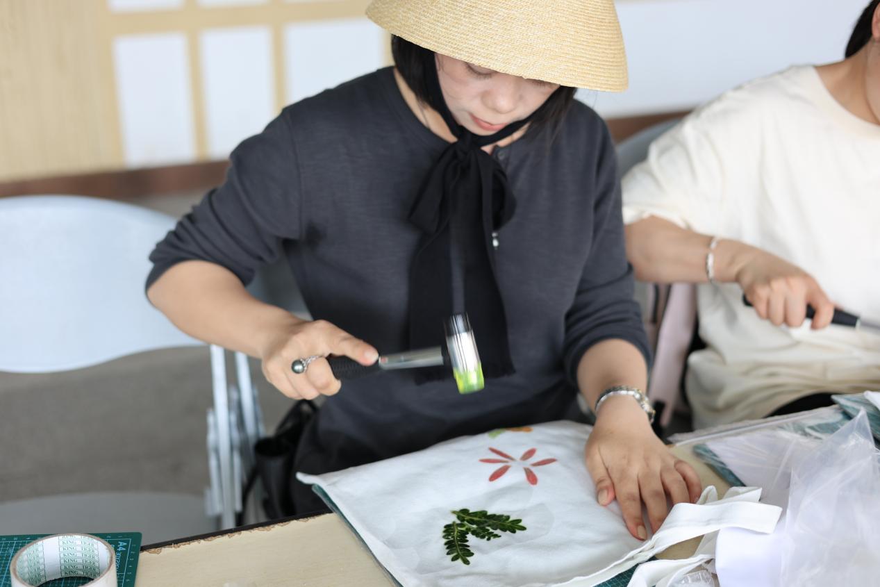 活动伊始,同学们便在志愿者的悉心讲解下,兴致勃勃地挑选心仪的叶片与花朵,在帆布包上精心布局。拓染的每一锤都像在聆听植物的心跳,随着一下下敲击,植物的汁液逐渐渗透到布料中,一幅幅独特的图案慢慢显现。