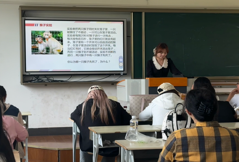 班会开始,辅导员以“猴子实验”为例,说明长期紧张焦虑对身心的负面影响,并引入情绪ABC理论,强调调整认知的重要性。同学们积极讨论,学习将“我必须考好”等不合理信念转变为“我希望考好”,减轻考试压力。