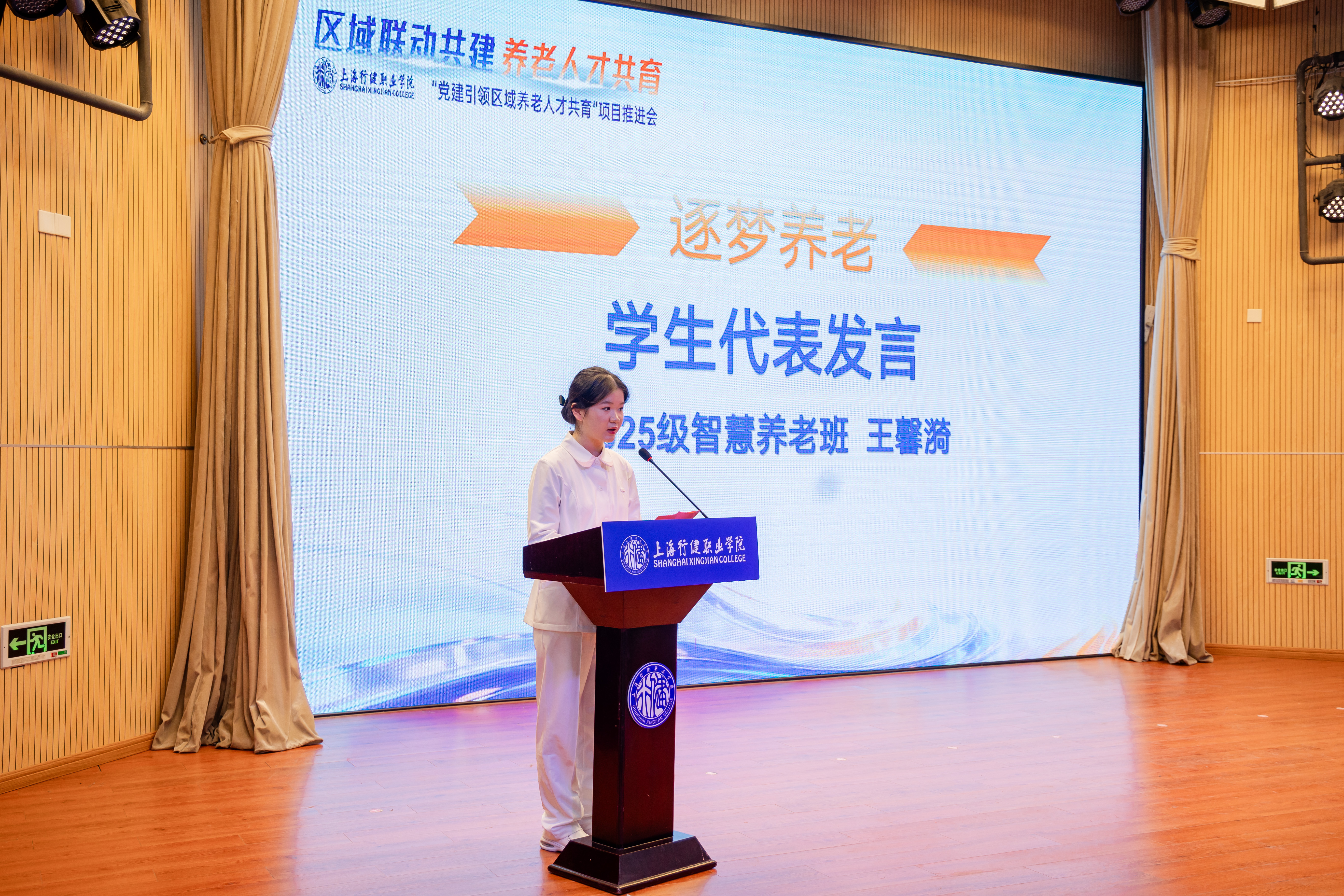 上海市第一社会福利院首席技师滕丽丽、2025级养老专业新生王馨漪同学分别代表学校智慧养老专业“技能大师工作室”和广大新生发言。