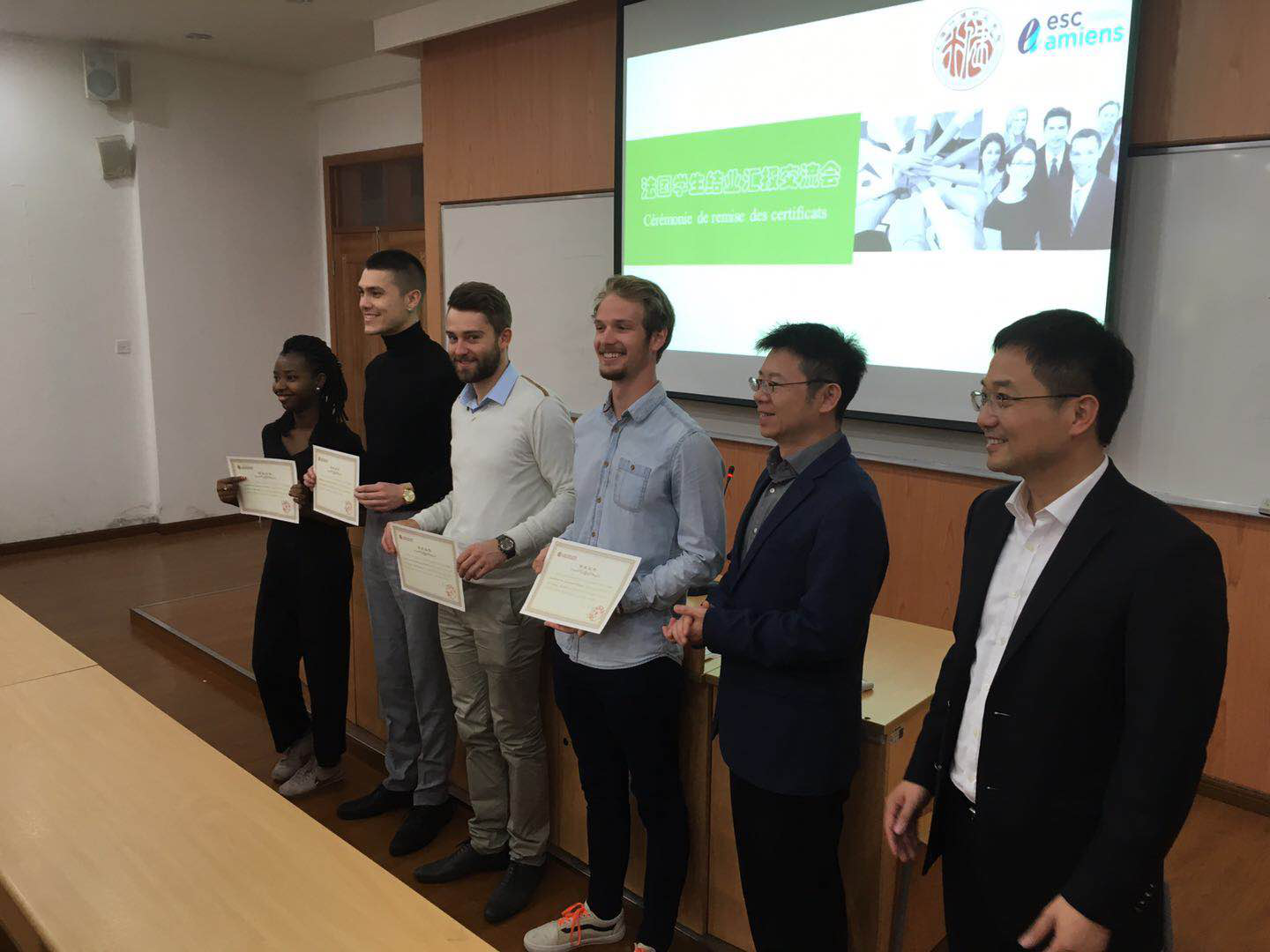 来自法国亚眠高等商学院的六位学生在我院交流的两个月期间,完成了相关的课程学习和讲座。交流会上,他们就参与的法国企业项目在上海市场的调研情况,向与会的领导、专业组教师做了详细汇报。黄群院长在致辞中对留学生的顺利结业表示了祝贺,并代表学院为他们颁发了结业证书。