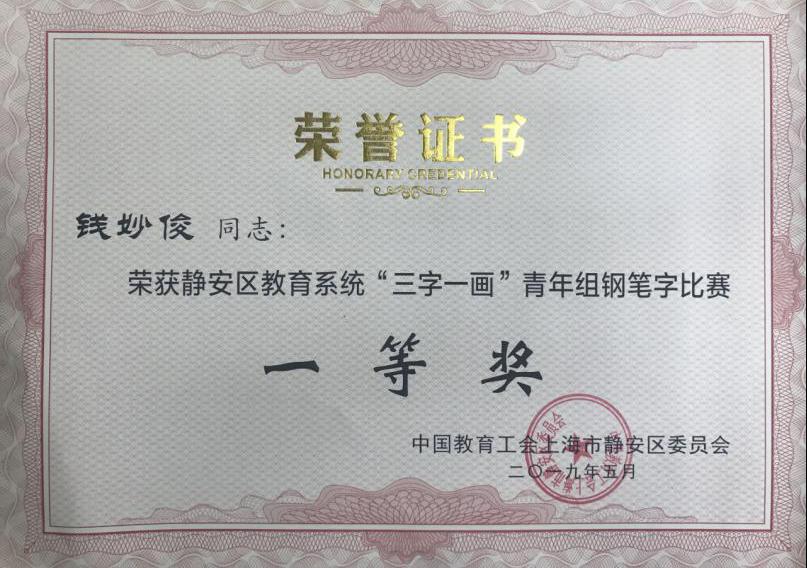 在静安区教育系统劳动竞赛系列活动——“三字一画”比赛中,经全国、市书画协会有关专家的评审,行健工会推送的钱妙俊老师以扎实的书画基本功获得青年组钢笔字比赛一等奖,同时,被教育工会选送参加由中国教育工会上海市委员会举办第六届上海教师书法·板书·钢笔字·中国画大赛,一展行健教职工的风采。(工会)