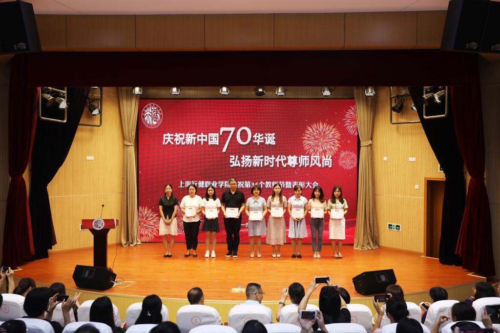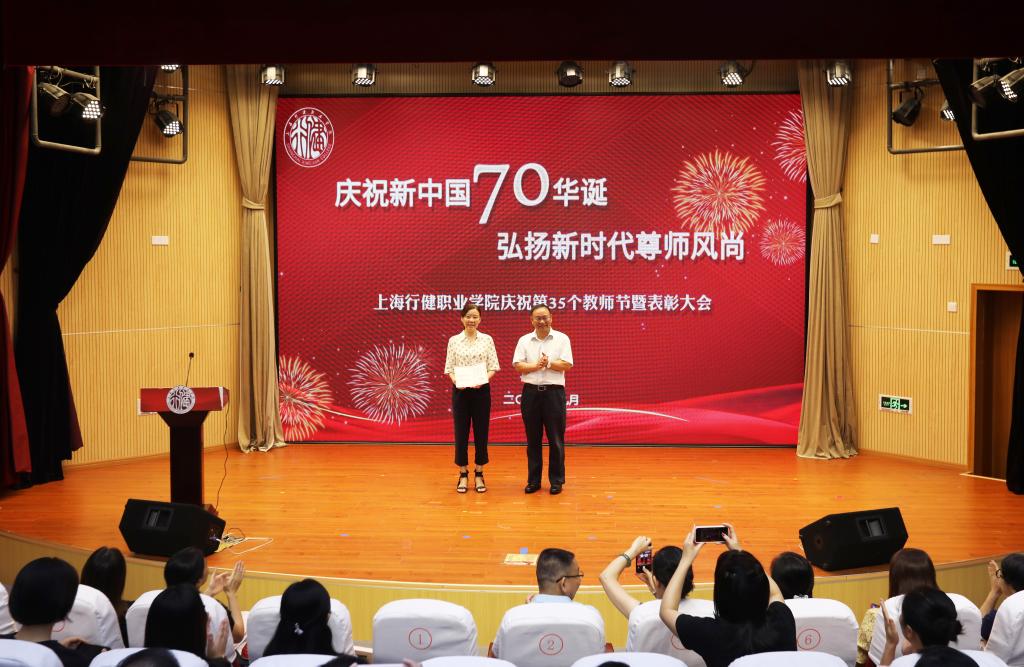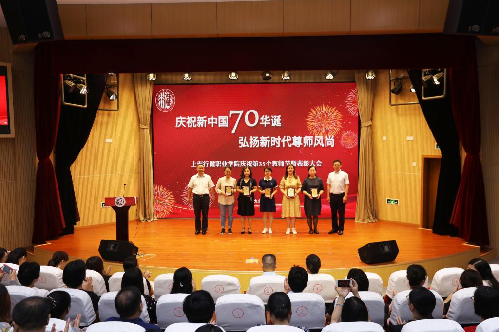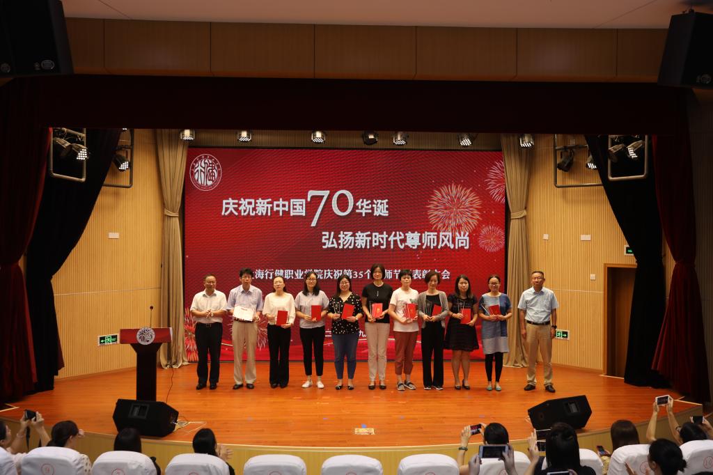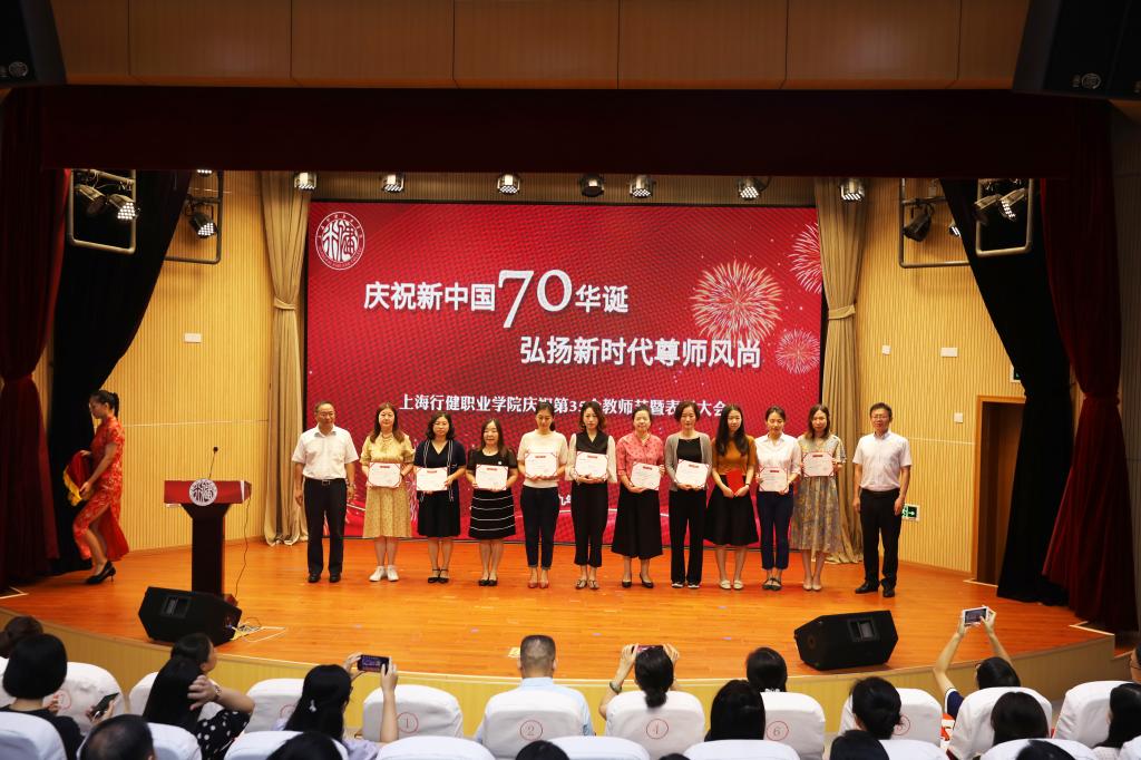本年度学院教师深入学习贯彻习近平新时代中国特色社会主义思想和全国、上海市教育大会精神,坚持落实立德树人根本任务,积极投身教育教学创新实践,做出突出贡献。首先,学院领导宣读相关表彰决定,并为获得“静安区园丁奖”、2017-2018学年“学生心目中的好老师”、在全国职业院校技能大赛和上海市“星光计划”、“汇创青春”展示活动等多项重要比赛中获奖的团队和个人进行颁奖。学院党委书记李国庆为从事教育工作三十年的赵慧老师颁发了证书,感谢她对教育事业的坚守和奉献。学院学生代表俞榕向全体教师致教师节贺辞,代表行健学子感念师恩,感谢老师的谆谆教诲和无私关爱。