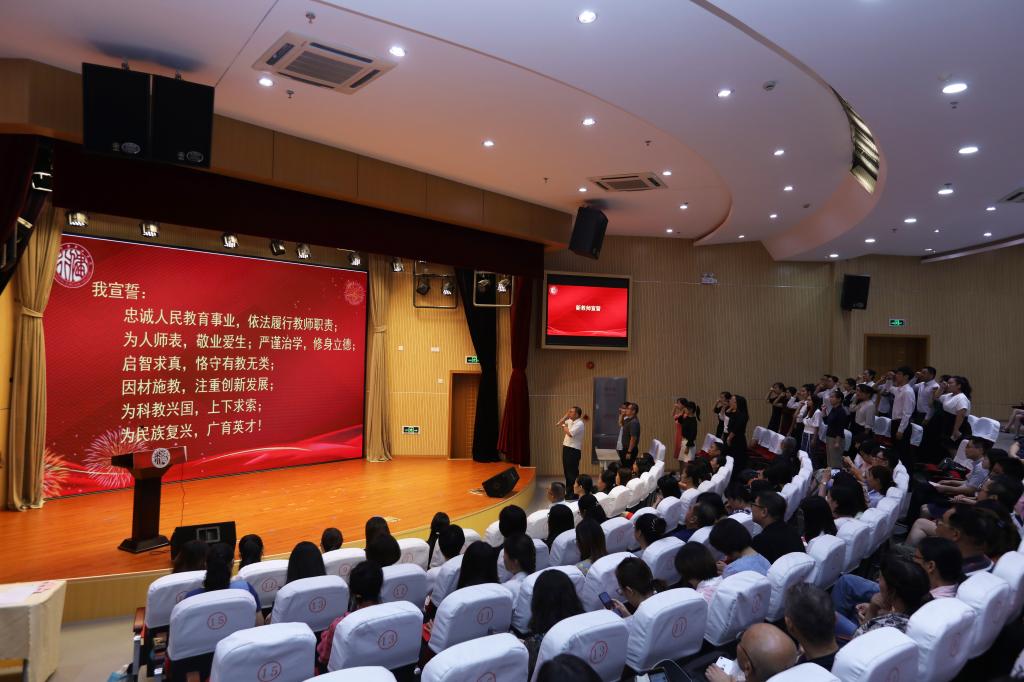 表彰会上,院长黄群向全体教师介绍了本年度学院新进教师,并由党委书记李国庆带领新进教师进行了宣誓。江志鹏作为新教师代表做交流发言,感谢学院关怀,立志奉献教育事业,努力做一名好老师,陪伴学生共同成长。