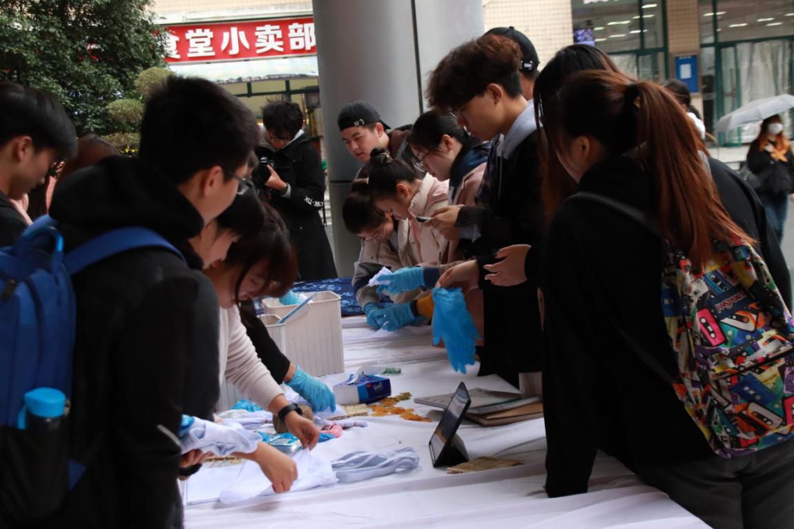 活动现场,艺术系的同学们在白坯布包上进行设计,从调配染料到各种手工染制、漂洗晾晒,一块普通的白布,经过浸湿、勒扎、涂染、打开晾干,布巾、布包、T恤等一件件扎染设计作品展现在众人眼前。其图案千姿百态、若隐若现、韵味别致。大批同学驻足观看,同时现场提供方巾让同学们体验,在专业老师的指导下,同学们纷纷针对自己的作品进行不同折法和叠法的尝试,制作的扎结及配色的方法各不相同,一块块方巾在同学们的精心打造后,焕然一新,形成了各种各样、丰富多彩的图案。从选取色彩到创意生成,再到作品完成,都体现了同学们的巧思和天马行空的想象力。