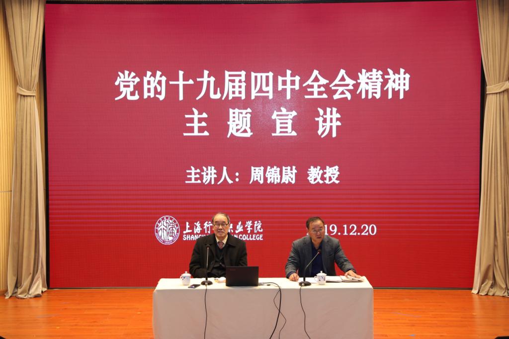 根据中央统一部署和市委、市教卫党委关于组织开展学习贯彻十九届四中全会精神主题宣讲活动的通知要求,12月20日,学院邀请上海市委讲师团专家、上海马克思主义研究会专家委员会副主任周锦尉教授来院做学习党的十九届四中全会精神辅导报告。报告会由党委书记李国庆主持。学院校级领导、中层干部和教职工近300人聆听辅导报告。