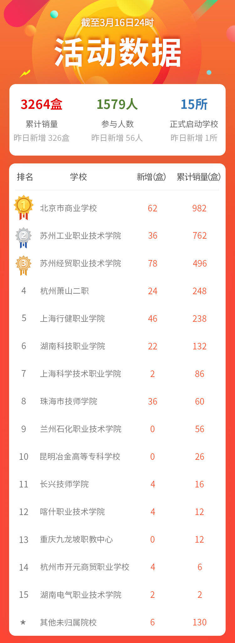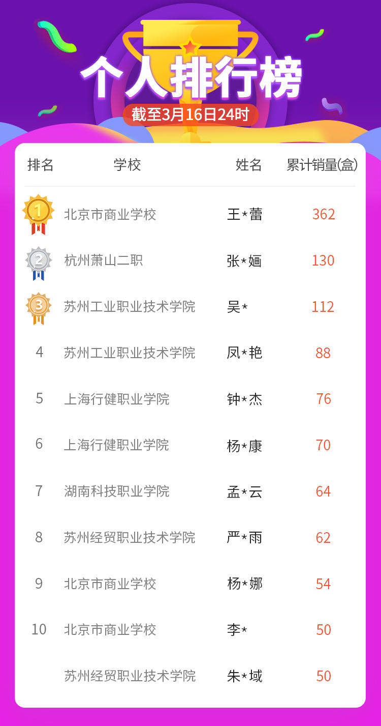 本活动充分发挥了职业教育支撑产业发展的优势,通过电子商务等数字经济业态,支持企业复工生产,这些企业大部分为支持抗疫前线贡献着力量。同时,通过远程方式开展技能实训,也丰富了疫情期间同学们的学习和生活。从3月10日开始,截止3月16日,我院学子协助企业销售产品共计238盒,排名全国第五名;喀什职业技术学院的同学们一共销售了12盒,排名全国第十二名。我院钟一杰老师和杨朝康同学分别以76盒与70盒的成绩排名个人榜单第五和第六位。