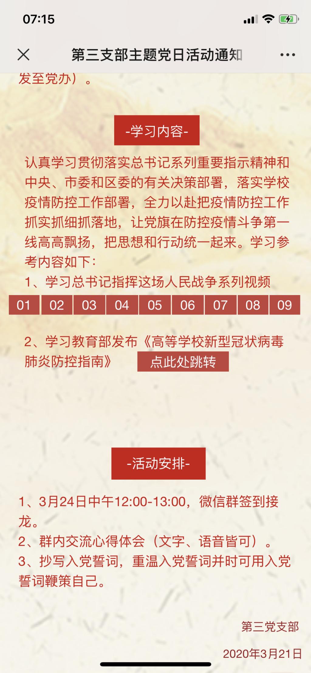 近日,学院第三支部开展“把初心落在行动上,把使命担在肩膀上”线上主题党日活动。活动通过支部微信群、学习强国平台、易企秀平台开展,全体党员准时参加。