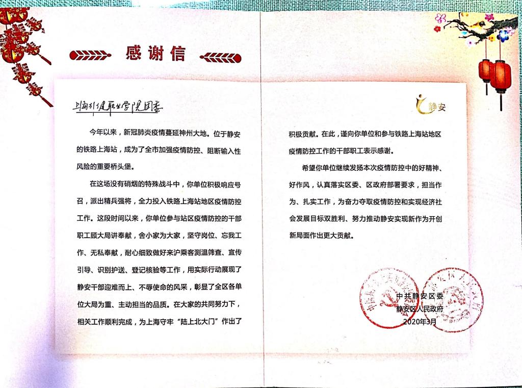 2020年3月,我院团委收到了来自中共静安区委、静安区人民政府的感谢信,对我院积极响应号召以及组织15名志愿者同学全力投入铁路上海站地区疫情防控工作表示感谢。