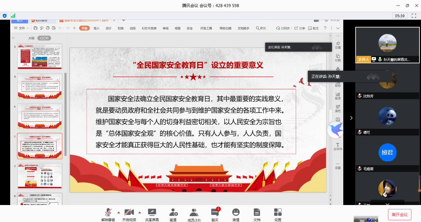 一是开展了一堂微型党课。国家安全与每个普通人的生活息息相关,实现国家总体安全需要加强全员的安全教育,要从思想上认识到国家安全的重要性、普遍性和相关性。系党支部书记从设立全民国家安全教育日的重要意义、国家安全的主要内容以及维护国家安全怎么做等方面进行了系统的阐述,带领大家深入学习领会习近平总书记关于全面依法治国、坚持总体国家安全观的重要思想、重要指示,充分认识坚持总体国家安全观、维护国家安全的丰富内涵和重大意义。孙书记围绕依法防控新冠肺炎疫情,带领大家学习传染病防治法、突发事件应对法、野生动物保护法、国境卫生检疫法等相关法律法规,突出非传统安全内容,通过微党课的形式在支部中形成维护国家安全的浓厚氛围。