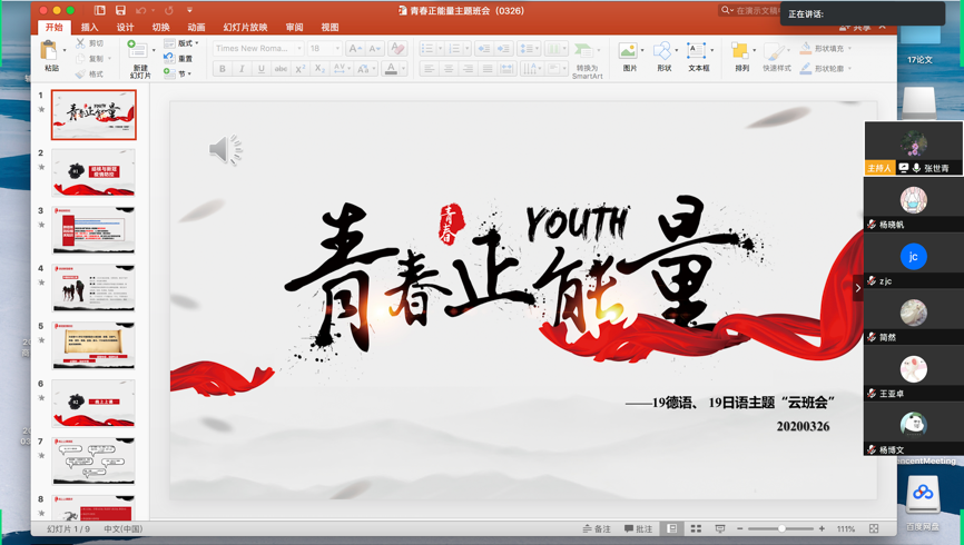因突如其来的新冠疫情,新学期线下授课转为线上授课,商务外语系线上育人工作积极有序进行。系部近期开展了一系列主题教育活动,如“青春正能量”、“青春战疫,青年担当”、“共克时艰、暖流将融坚冰”等主题班会。各个班级利用易班、腾讯会议等形式,以一种格外温暖而创新的方式在空中相遇。