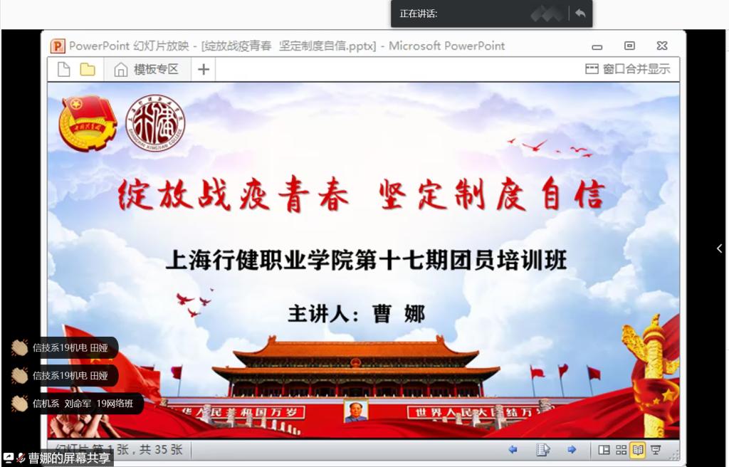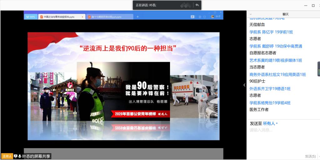面对当前国内常态化疫情防控与经济社会秩序全面恢复的挑战及复杂的国内外形势,为了引导广大团员青年、团干部保持清醒理智头脑,理性看待各种舆论信息,学院团委于四月初开始筹备第十七期团员培训班。通过聚焦学习党的十九届四中全会精神,发挥团组织教育青年的功能,引领团员青年们在抗击疫情的各个时期自觉落实疫情防控各项要求,在全面建成小康社会收官之年展现青春风采、作出积极贡献。此次培训班学员由19级各班级团支部通过民主推选、团委审核产生,共计198名学员参加培训。4月24日中午,学院第十七期团员培训班首次以云端方式在腾讯会议平台正式开班,团委办公室主任叶忞主持培训会议。