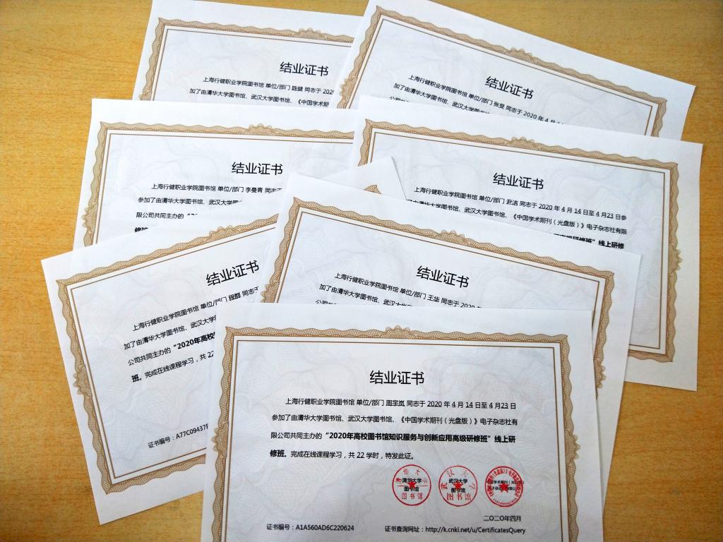 为更好地推动高校图书馆疫情期间的服务及未来创新发展,中国知网联合清华大学图书馆、武汉大学图书馆,特邀22位国内外图情界专家,在4月14日至23日,开展“2020高校图书馆知识服务与创新应用高级研修班”在线直播活动。我院图书馆全体成员在馆长的组织带领下,积极报名参与,认真完成每日线上学习任务,修满为期10日共计22个讲座的全部课程,获得了研修班证书。