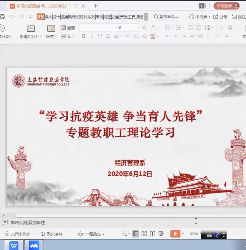 此次会议由经管系党支部书记孙天慧主持,经管系主任严威及全体教职工参会。会上,经管系全体教职工共同学习了12个不同主题的抗疫英雄先进事迹,他们分别是:抗“疫”战士之检测--王河清、抗“疫”战士之担当——赵琴、抗“疫”战士之出征——孙焱、抗“疫”战士之医者——张文宏、抗“疫”战士之科研——徐建青、抗“疫”战士之媒介——马红漫、抗“疫”战士之城池——张霞慧、抗“疫”战士之安定——居仕明、抗“疫”战士之职责——张欣欣、抗“疫”战士之师道——方玥、抗“疫”战士之云端——尚明曦、抗“疫”战士之堡垒——朱同玉。当病毒袭来,一个个白衣天使、科技人员、解放军将士、党员干部迎难而上,他们同时间赛跑,与病魔较量,逆行的背影成了抗疫前线最美的风景。在抗疫英雄事迹的学习中,经管系教职工受益匪浅、感悟颇深,分别结合此次专题学习和抗疫期间的教育教学经历进行了学习交流。教师代表钟一杰、殷豆豆老师分享了自己抗疫期间的学习、工作和育人体会。