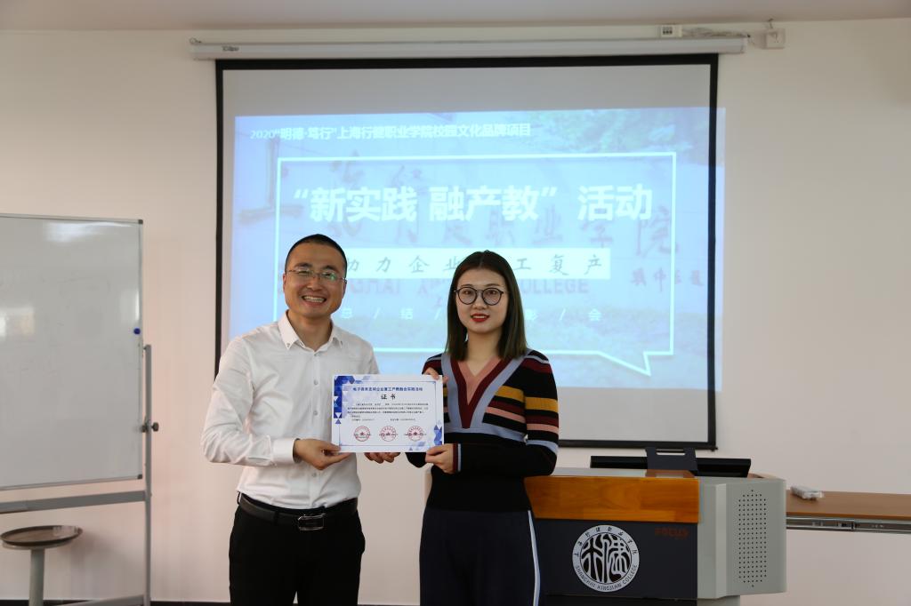 安徽慢慢来信息科技有限公司CEO杨富强耐心细致解答了同学们在交流过程中提出的问题,活动现场气氛极其热烈。经管系党支部书记孙天慧希望能够通过更多的产教融合的形式进一步提升学生的专业技能、提高就业创业能力,并号召有专业技能的同学加入到支持企业复工复产的大军,实现当代大学生对社会的价值创造。最后,安徽慢慢来信息科技有限公司CEO杨富强为参加活动的优秀指导老师和优秀同学颁发了由全国电子商务职业教育教学指导委员会、安徽侬安康食品有限公司、安徽慢慢来信息科技有限公司认证的活动证书。随着本次会议的落幕,为期两个多月的“新实践,融产教”支持企业复工复产活动圆满结束。(经管系)