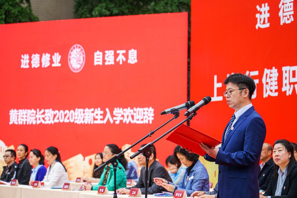 最后,黄群院长在致辞中表达了对20级新同学的欢迎,祝愿同学们在美丽的校园度过充实、奋进、快乐、成长的三年。黄群院长用一组数据向大家总体介绍学院这五年来取得的斐然成就。他指出,培养学生是大学的主要工作,是全体教师、学生,学校所有成员共同合奏出的“学习交响乐”。希望同学们和老师积极互动、教学相长、共同进步。黄院长对全体新生提出两点要求:一是立德、立业,德技并修。学院的校训是“进德修业、自强不息”。“进德修业”是君子致力于培育品德,增进学业。他希望20级新生充分把握时机,德技并修,知识水平和能力水平共同提升。二是力学、力行,知行合一。黄院长指出,习近平总书记多次告诫我们要牢记空谈误国、实干兴邦的道理,实实在在做人做事,学以致用,知行合一。实践是获取知识的途径,实践出真知。要求大家在学习和实践的过程中不断提高技术技能水平,养成良好的职业道德,成为社会需要的合格人才。
