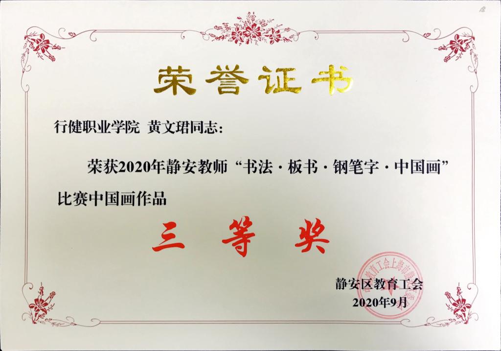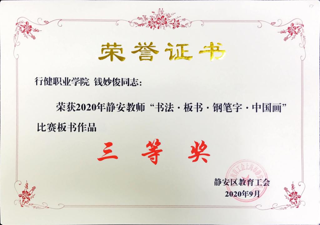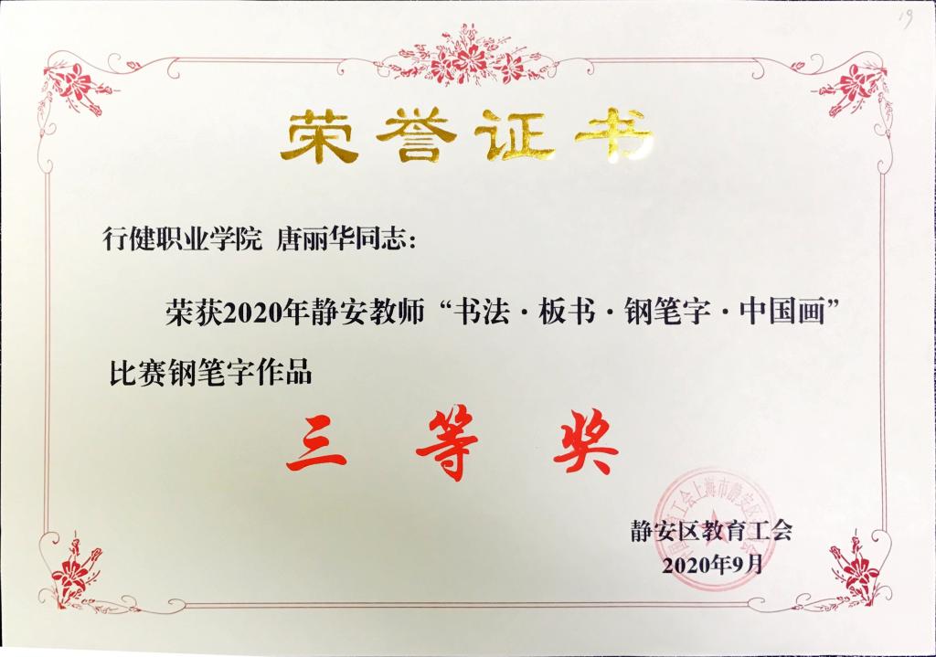 为进一步推进教师队伍建设,提高广大教师的教学素养,加强教学基本功训练,搭建教师学习交流的平台,在日前结束的静安区教育系统劳动竞赛系列活动--2020年静安教师“书法·板书·钢笔字·中国画”比赛中,学院工会选送的作品再获殊荣:钱妙俊获板书作品三等奖,唐丽华获钢笔字作品三等奖,黄文珺获中国画作品三等奖。(工会)