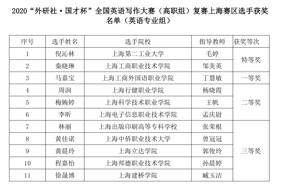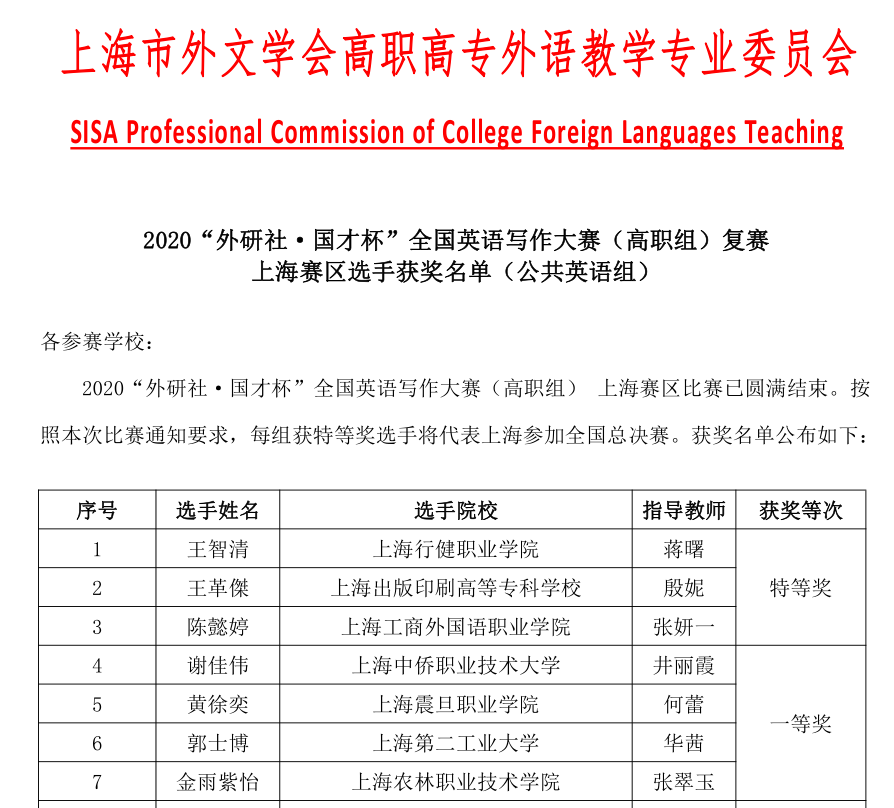 近日,由教育部职业院校外语类专业教育指导委员会、上海市外文学会高职高专外语教学专业委员会和外语教学与研究出版社共同主办的2020年“外研社·国才杯”全国英语写作大赛在上海工艺美术职业学院落下帷幕。我院商务外语系杨晓霞老师指导的周润同学荣获英语专业组二等奖。信机系蒋曙老师指导的王智清同学荣获公共英语组特等奖,王智清同学将代表上海参加全国总决赛。