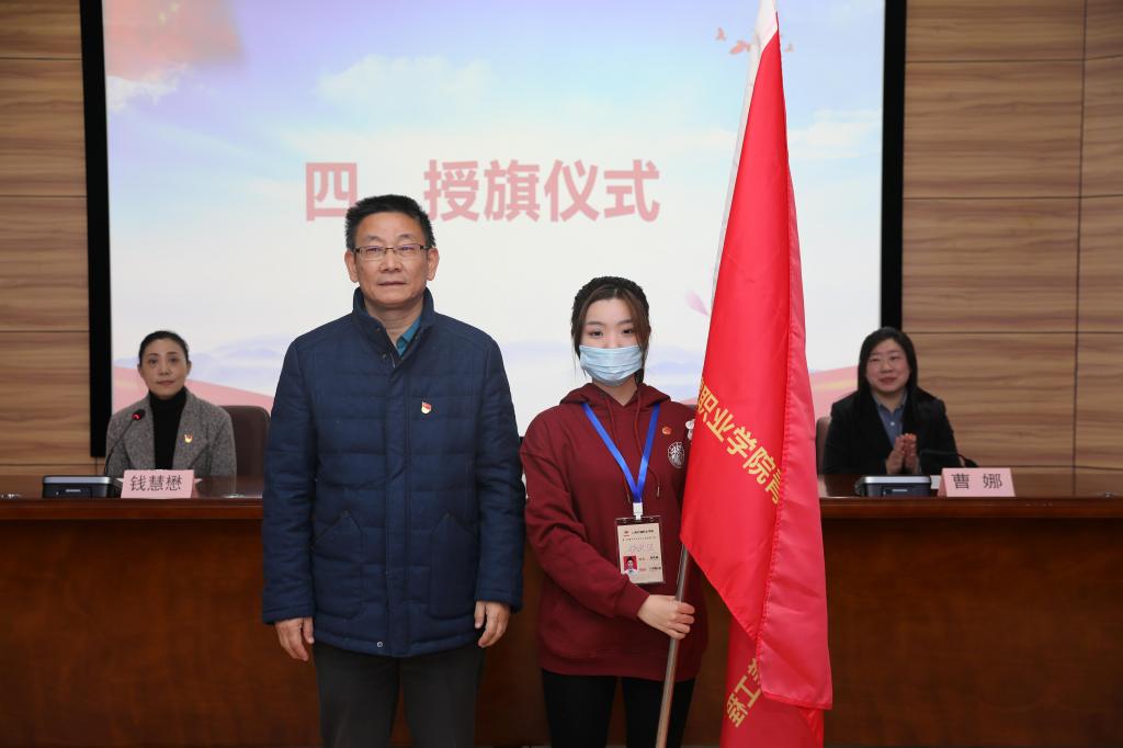 学院党委副书记李越为青马班授旗,学员代表郑欢琪接过旗帜。青马旗作为青马班的精神指引,更是凝聚着学院党委对大学生骨干的殷切期望和重托。接下来,青马班班长陈昊作为学员代表发言并带领全体学员郑重宣誓:一定会完成青马工程的各项内容,为成为乐于奉献的青年马克思主义者不懈奋斗!