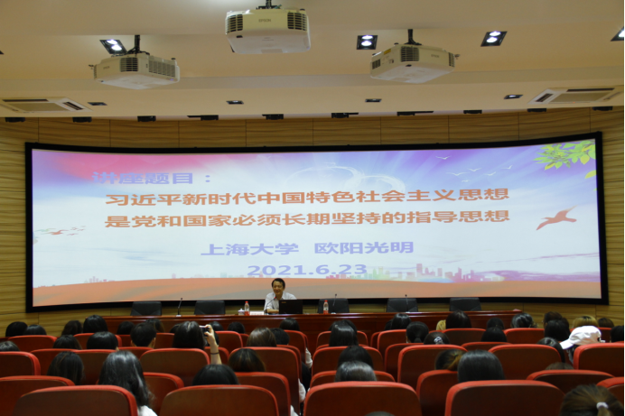 为贯彻落实《关于加强和改进新形势下高校思想政治工作的意见》,积极推进习近平新时代中国特色社会主义思想“三进”工作,全面贯彻党的教育方针,坚持社会主义办学方向,坚持马克思主义指导地位,贯彻落实习近平新时代中国特色社会主义思想,培养担当民族复兴大任的时代新人。结合我院师生党史学习教育,6月23日下午,受思政部邀请,上海大学马克思主义学院欧阳光明教授为我院师生作了党史学习教育之“习近平新时代中国特色社会主义思想概论”专题讲座。院党委书记沈燕华、思政部全体教师和各专业学生参加讲座。