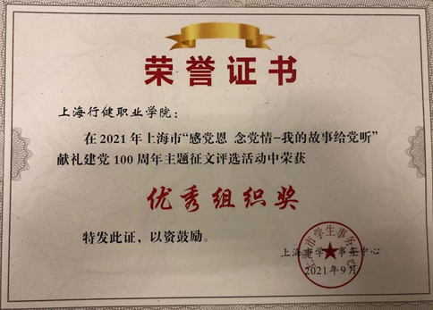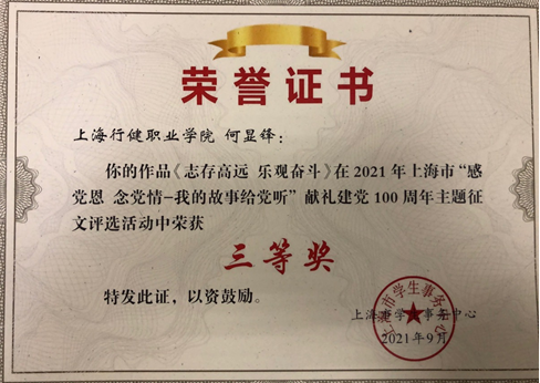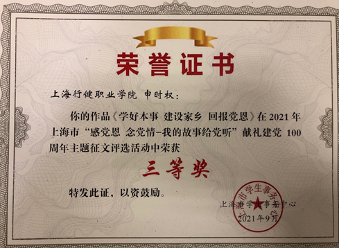 近日,由上海市学生事务中心举办的“感党恩 念党情——我的故事给党听”献礼建党100周年主题征文活动评选结果揭晓,学院荣获“优秀组织奖”称号,信息技术与机电工程系申时权同学的《学好本事,建设家乡,回报党恩》和经济管理系何显锋同学的《志存高远,乐观奋斗》两篇文章荣获高校组三等奖。