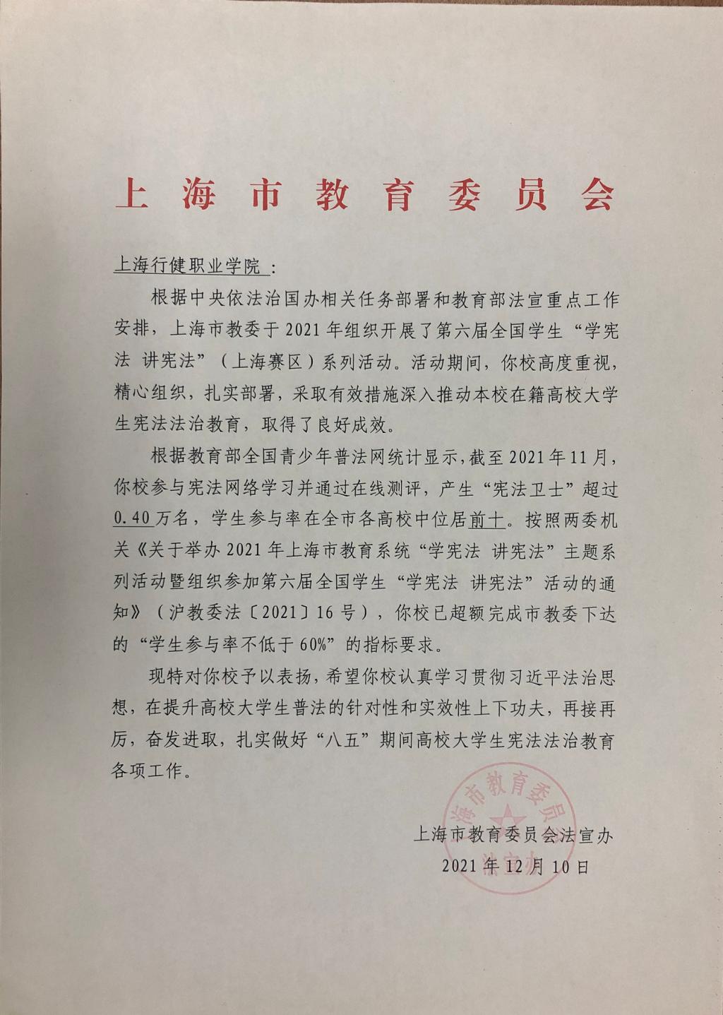 近日,上海市教委法宣办发来表扬信,对学院超额完成市教委下达的学生参与率指标予以高度赞扬,肯定了我院提升大学生普法工作的针对性和时效性,并希望学院再接再厉,扎实做好“八五”期间高校大学生宪法法治教育各项工作。